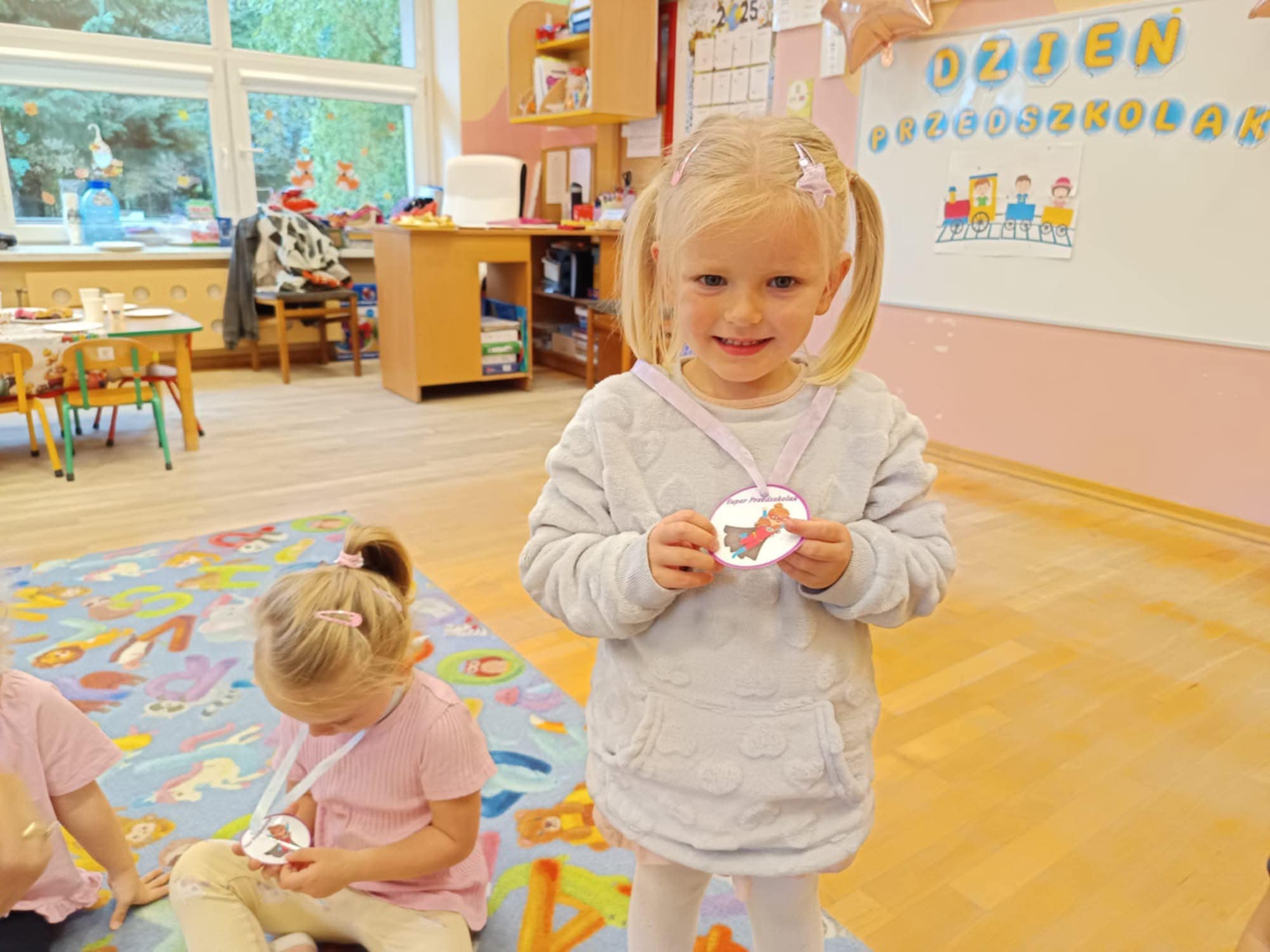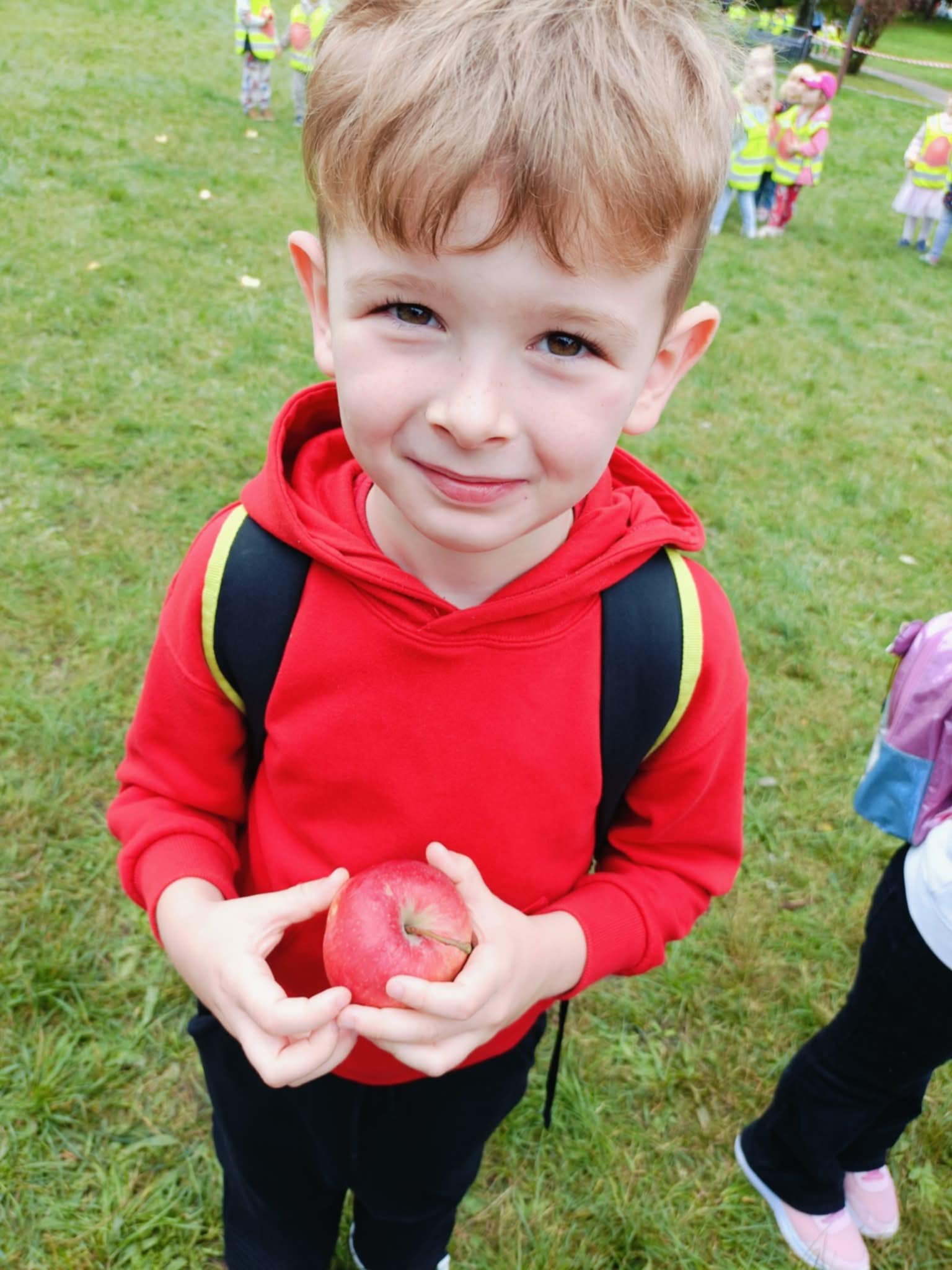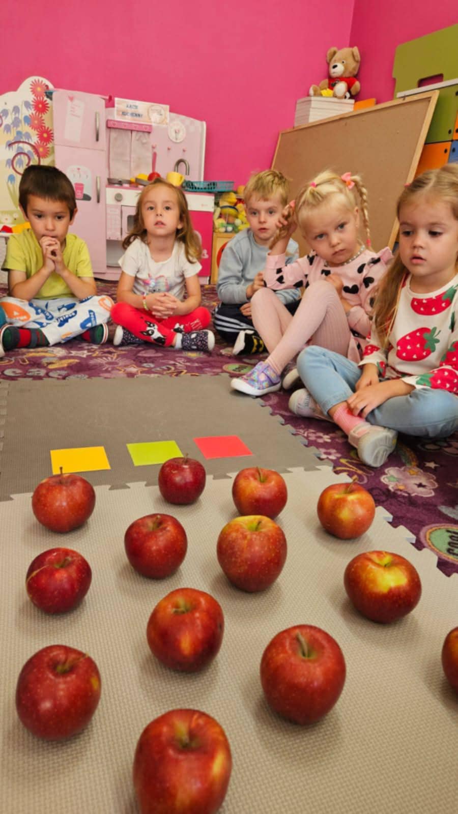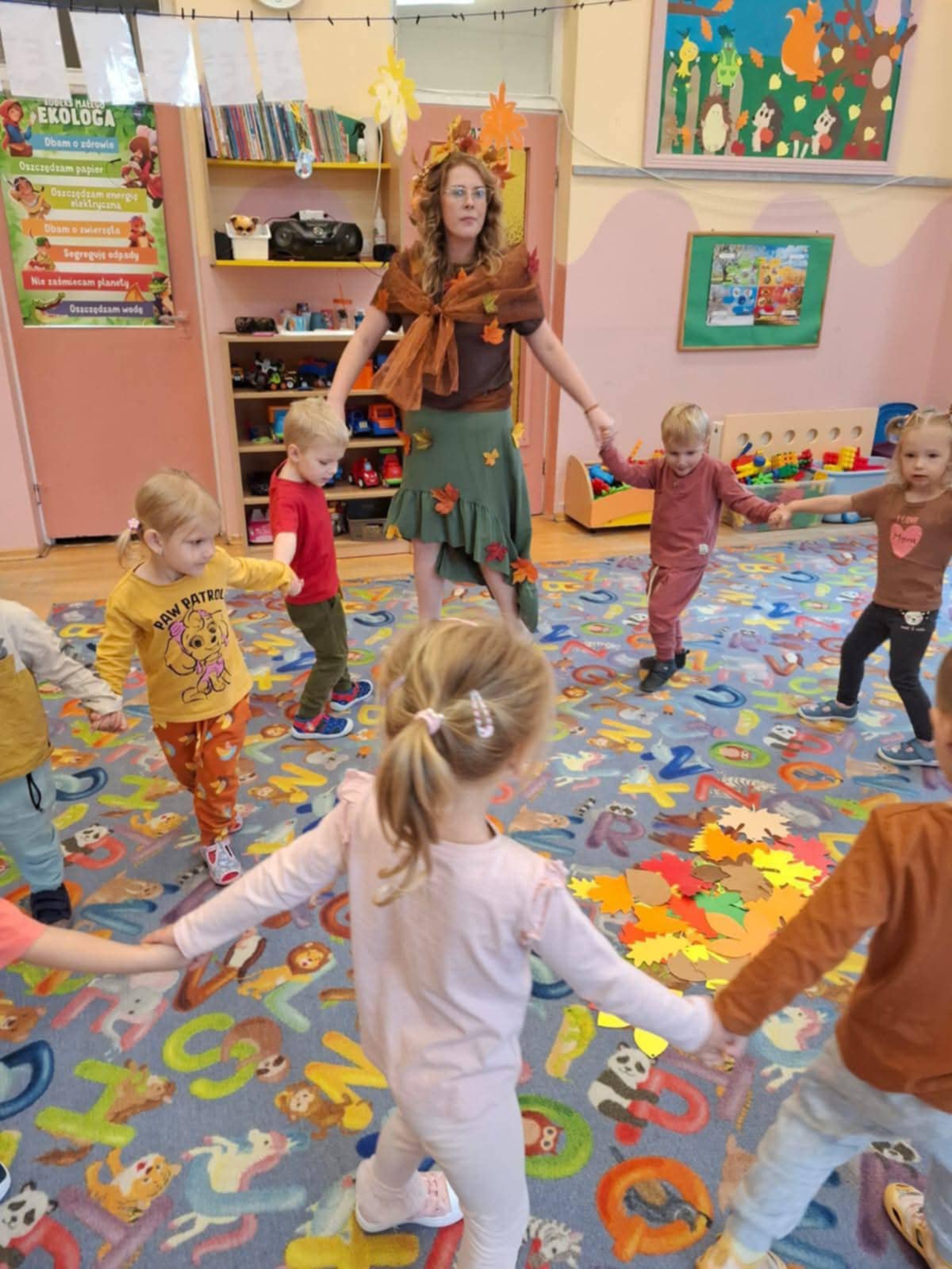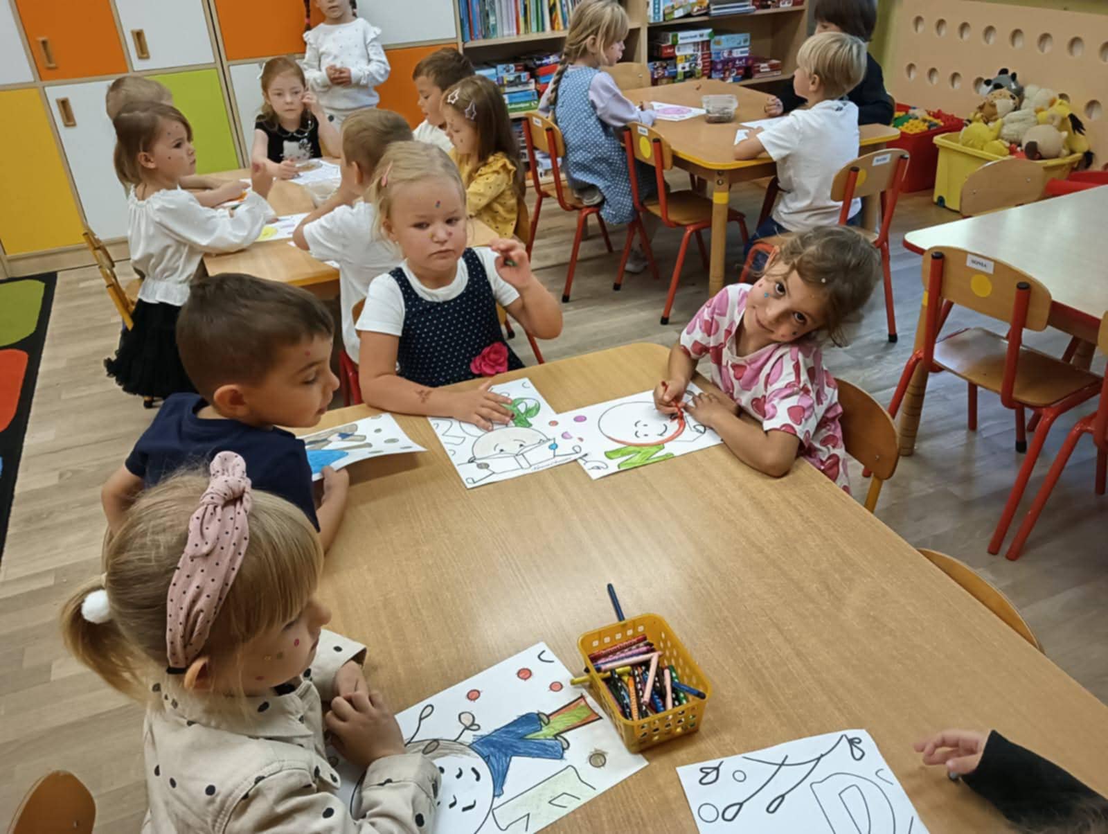 Nie zabrakło również ważnych spotkań — odwiedziła nas Straż Miejska, przypominając zasady bezpieczeństwa. Była też wycieczka do Figloraju, bicie rekordu w jedzeniu jabłek, a także radosne obchody Dnia Przedszkolaka, Dnia Jesieni i Dnia Jabłka.